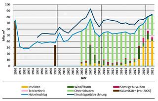 Abbildung 7: Entwicklung des Holzeinschlags inklusive Anteile an Schadholz in Millionen Erntefestmeter von 1990 bis 2021, Quelle: Reise et al (2024). Anmerkung: Trockenheit als Schadensursache wird erst seit 2020 erfasst