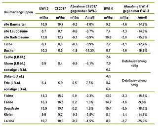 Der Zuwachs der Bäume hat in der Periode der BWI-4 (2012-2022) gegenüber der BWI-3 (2002-2012) gemittelt über alle Baumarten um 14,9 % abgenommen. Laut Kohlenstoffinventur (CI-2017, Periode 2012-2017) war der Rückgang nur 1,8 %. Wenn man annimmt, dass dieser Rückgang aus der Alterung der Waldbestände resultiert, wäre in der BWI-4 ein Rückgang von ca. 3,6 % erwartbar gewesen. Der Rückgang des Zuwachses von ca. 11 % steht voraussichtlich in Verbindung mit den schlechten Wuchsbedingungen in der Periode 2017 bis 2022. Der genaue Anteil insbesondere gegenüber der CI-2017 wird bei 25 bis 30 % liegen. Dies ist allerdings eine grobe Einordung. Eine genaue Auswertung bedarf der Detaildaten der BWI-4 und der CI-2017 (noch nicht veröffentlicht).