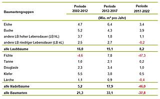 Für Laubbäume nahm der Vorratsaufbau von der Periode 2002 bis 2012 zur Periode 2012 bis 2017 – trotz Zunahme der Laubbaumbestände durch Waldumbau – leicht ab. In der Periode 2017 bis 2022 trat für Laubbäume immer noch eine Zunahme der Vorräte auf, und die Laubbäume waren eine CO2-Senke, der Holzvorratsaufbau halbierte sich aber in etwa. Dies ist auf eine Kombination aus Zuwachsverringerung und leicht erhöhter Mortalität bei den Laubbäumen zurückzuführen.