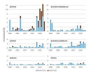 Die Mortalität der Bäume hat laut Waldzustandserhebung (WZE) seit dem Jahr 2018 zugenommen. Vor allem für Fichte stieg die Mortalitätsrate durch abiotische (Trockenheit, Sturm) und biotische Gründe (Kalamitäten) in den Jahren 2018 bis 2022 auf Werte von 9 % bis 12 % sehr stark an. Bei Kiefer sowie andere Nadel- und Laubbäume traten ebenfalls erhöhte Mortalitätsraten mit Werten von unter 3 % auf. Moderate Anstiege der Mortalitätsrate wurden für Buchen und Eichen mit Werten unter 1% erfasst. Für Eiche ist in der Höhe kein Unterschied gegenüber historischen Werten zu sehen, biotische Gründe haben aber zugenommen.