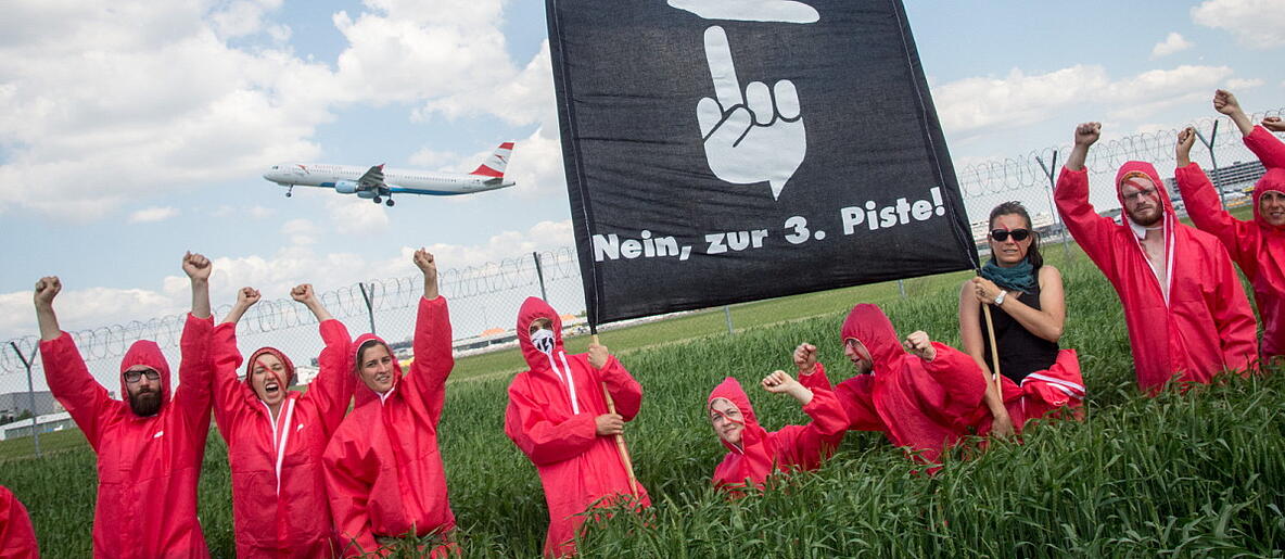 2016 begann ich, mich mit der Initiative „System Change, not Climate Change“ gegen den Bau einer dritten Start- und Landebahn am Flughafen Wien einzusetzen. Unsere erste Aktion bestand daraus, mit hunderten von Menschen eine rote Linie auf der Fläche zu ziehen, sowohl im Terminal als auch auf dem Acker, wo die Piste hinkommen sollte. Wir hatten im Vorfeld Erfahrungen anderer Gruppen eingeholt, die bereits gegen den Flughafenausbau in London-Heathrow oder auch in Mexiko Stadt und Istanbul protestierten und mussten feststellen: Es gab bisher keine Vernetzung zwischen Initiativen, die sich gegen das unbegrenzte Wachstum des Flugverkehrs engagieren. Der Aktionstag wurde global: In sieben Ländern fanden Proteste gegen die Verdrängung durch Flughafenprojekte und für eine Verringerung des klimaschädlichen Flugverkehrs statt. Damals beschlossen wir, die Vernetzung auszubauen.