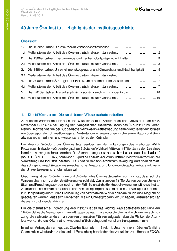 - Vermittlung von Kontakten zu Wissenschaftlerinnen und Wissenschaftlern des Öko-Instituts
