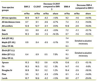 - According to BWI-4, tree growth decreased by 14.9 percent in the 2012-2022 period. According to the interim inventory, only a slight decline in tree growth of 1.8 percent was observed in the 2012-2017 period. In the 2017-2022 period, a decline in tree growth of over 25 percent can therefore be expected, resulting from the poor conditions for growth in this period (see Annex 2).