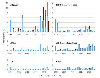 - The mortality rate for spruce rose to 9 to 12 percent in the 2017-2022 period. For other tree species, the increase in the mortality rate was significantly lower, particularly for oak and beech (see Annex 1).