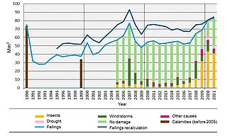 Figure 7: Development of timber production including the share of damaged timber in millions of cubic metres harvested from 1990 to 2021, Source: Reise et al (2024). Note: Drought as a cause of damage has only been recorded since 2020.