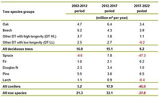 For deciduous trees, the stock build-up decreased slightly from the 2002-2012 period to the 2012-2017 period, despite an increase in deciduous tree stocks due to forest conversion. In the 2017-2022 period, the stocks of deciduous trees also increased and comprised a carbon sink. However, the growing stock build-up roughly halved. This was due to a combination of a decline in tree growth and a slightly increased mortality rate for deciduous trees.