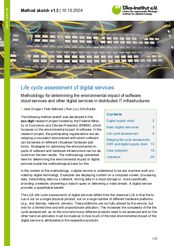 Data centres, servers, cloud and data services – IT infrastructures provide processing power, storage capacity, application software and database services, which do not have to be installed locally by the user but are available via an Internet connection. These applications and services can have significant adverse environmental impacts, which are associated with resource extraction and the production, use and ultimately the disposal of the digital products on which they are based. Determining and assessing the environmental performance of IT infrastructures is a complex process as they often rely on a large number of IT products which together comprise the IT system.