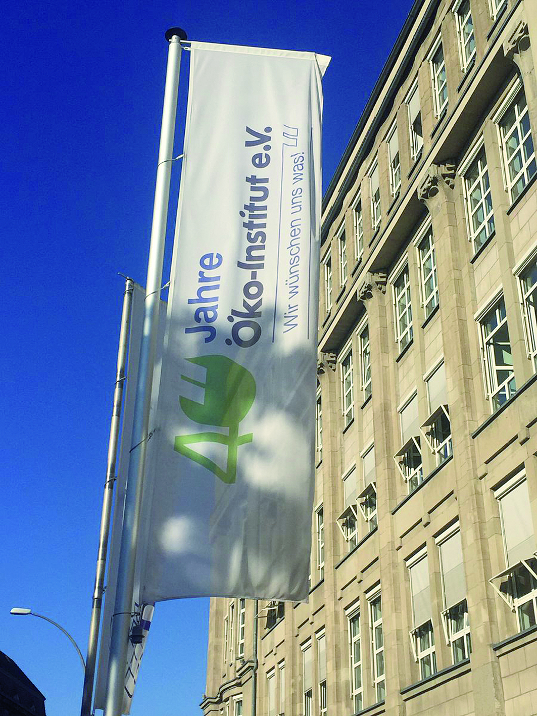 Darüber hinaus haben wir gefeiert – eine schöne erste Feier in Freiburg mit unseren Wegbegleiterinnen und Wegbegleitern und ein großes Jubiläumsevent in Berlin mit zahlreichen weiteren hochrangigen Gästen. Auch die eco@work hatte im Juni 2017 ein Jubiläumskleid angezogen, Sie erinnern sich sicherlich. Besonders gefreut habe ich mich persönlich übrigens auch über die Jubiläumsfahnen, die wir an unseren drei Standorten in Berlin, Freiburg und Darmstadt gehisst haben. Sie haben das Jahr über weithin gezeigt, dass wir unseren 40. Jahrestag feiern.