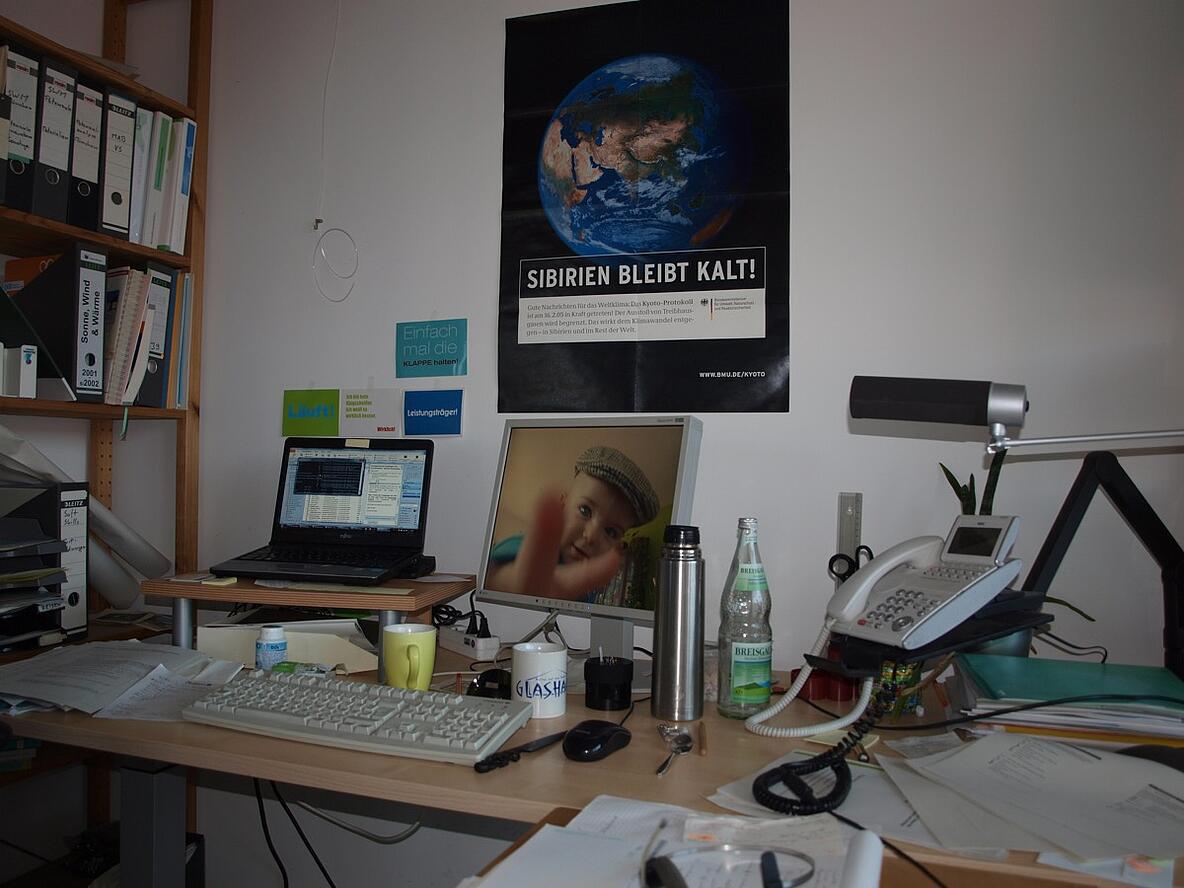 Ein Plakat fängt sofort den Blick beim Betreten des Büros von Dominik Seebach, Senior Researcher im Bereich Energie & Klimaschutz Freiburg: Sibirien bleibt kalt! Der Grund: Russland hatte das Kyoto-Protokoll ratifiziert und damit trat es verbindlich in Kraft. Er selbst arbeitet zu Klimaschutz und erneuerbaren Energien. Damit auch sein Sohn – siehe Bildschirm – und alle anderen noch lange den Winter im nahegelegenen Schwarzwald oder im fernen Sibirien genießen können.