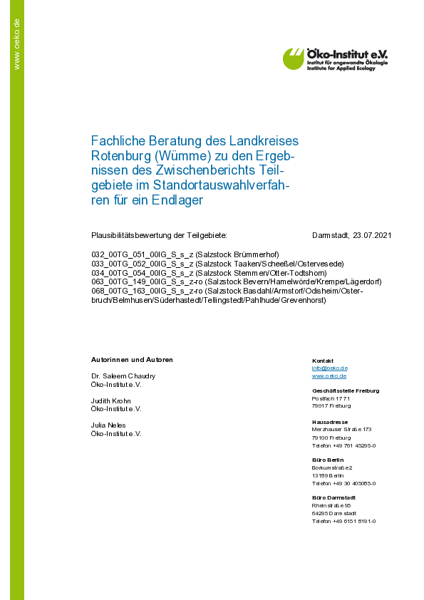 Fachliche Beratung des Landkreises Rotenburg (Wümme) zu den Ergebnissen des Zwischenberichts Teilgebiete im Standortauswahl-verfahren für ein Endlager